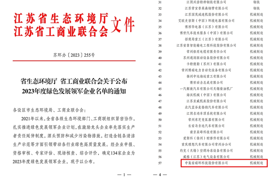 近期,江蘇省生態(tài)環(huán)境廳與江蘇省工商業(yè)聯(lián)合會聯(lián)合發(fā)布“2023年度綠色發(fā)展領軍企業(yè)”名單,中集安瑞環(huán)科技股份有限公司上榜。